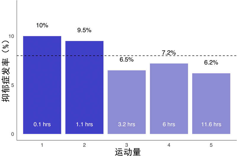 • 低水平身体活动(0–1.1 小时/周)人群抑郁发生率最高(约 9.5–10%)。